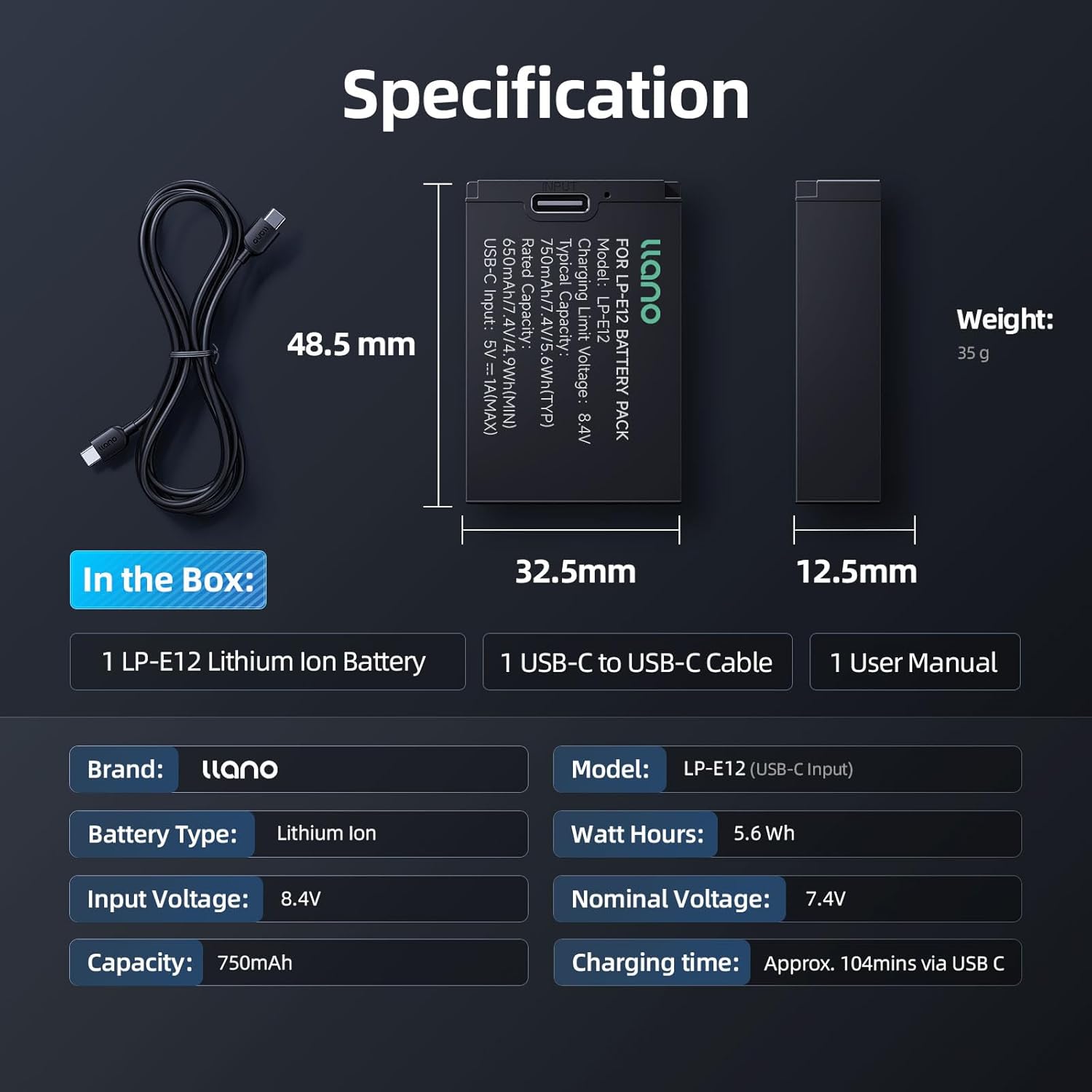 【Long Cycle Life】 llano LP-E12 rechargeable lithium-ion battery can be charged and discharged 500 times and has excellent sustained lifespan, free from memory effect. Battery capacity: 750mAh, voltage: 7.4V, watt hours: 5.6Wh. With longer battery life for long video production and photography projects.